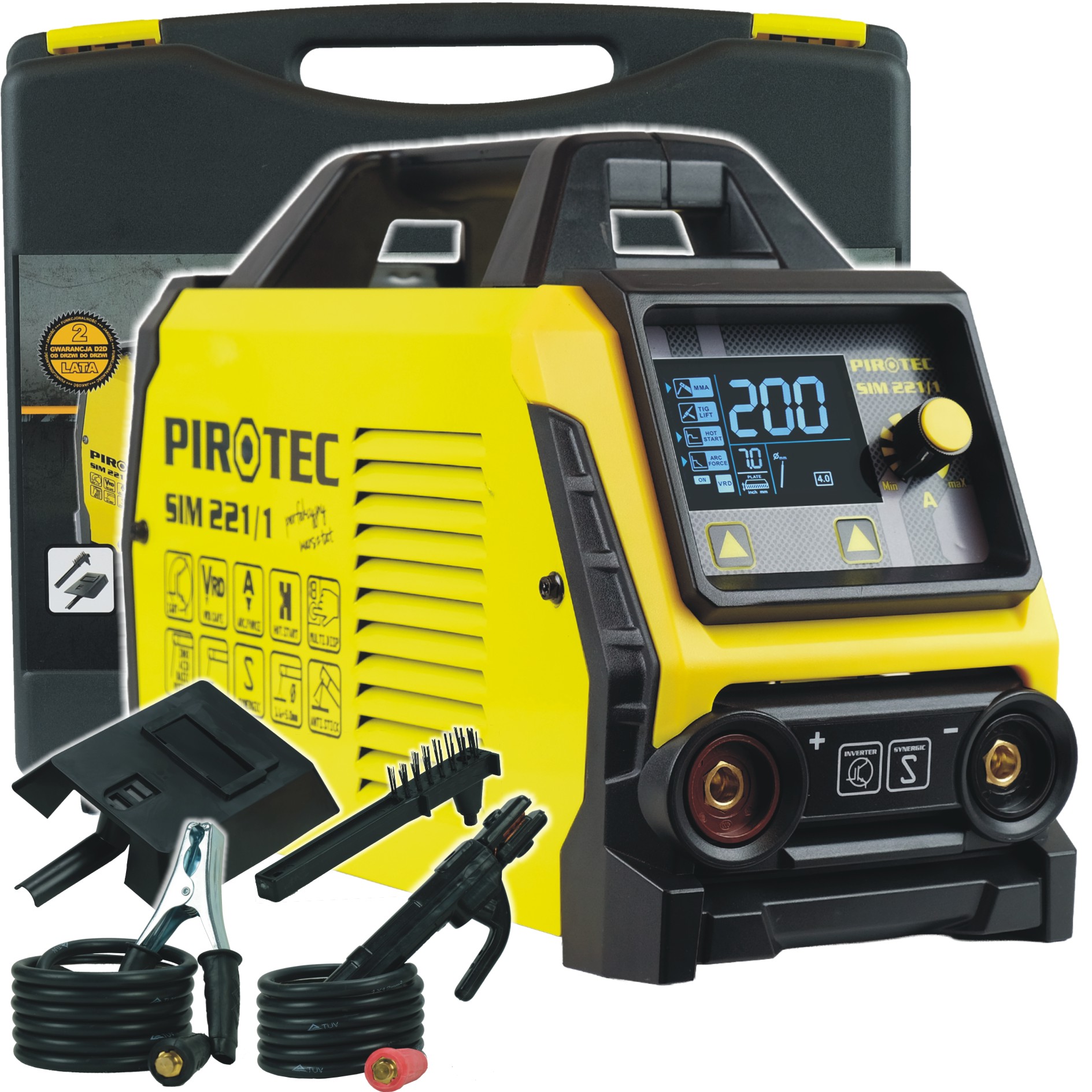 | STANDARDOWE WYPOSAŻENIE | przewód zasilający zintegrowany z wtyczką, przewody spawalnicze na złączach, uchwyt i zacisk spawalniczy, szczotka z młotkiem i tarcza ochronna |